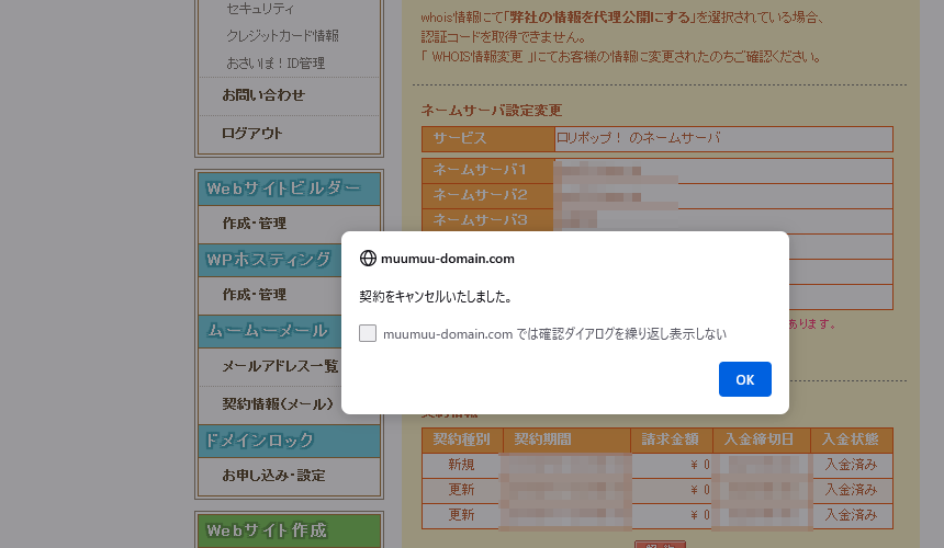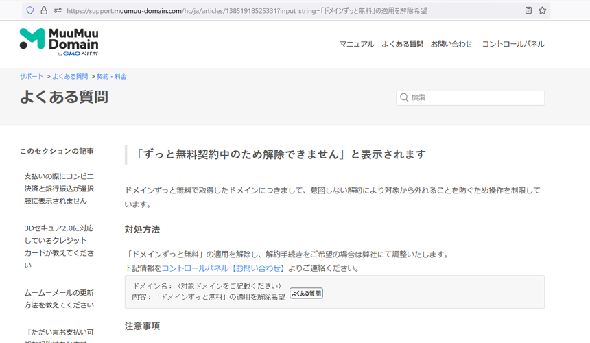 ムームードメイン公式サイト:「ずっと無料契約中のため解除できません」と表示されます