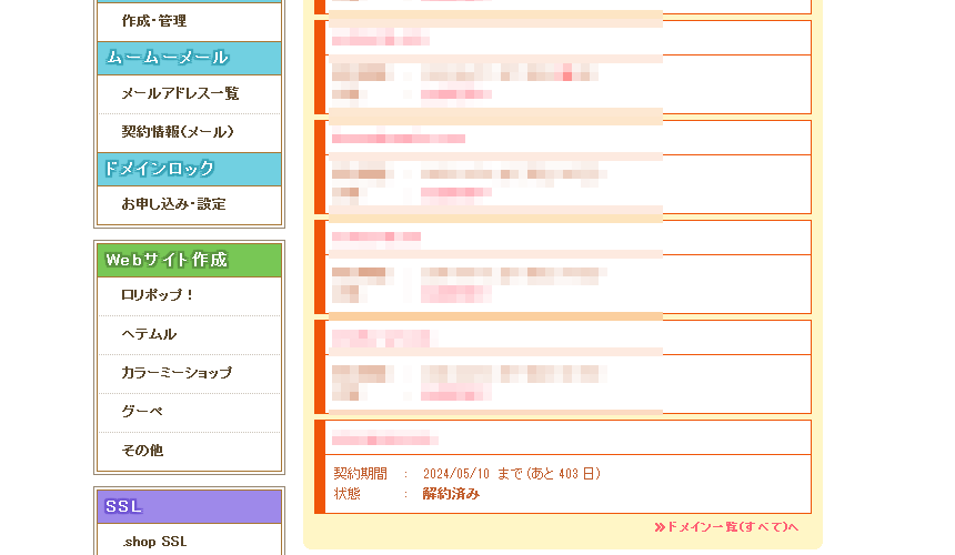 ムームードメイン側から完了したとメールが届きます。コントロールパネルにログインすると、「解約ボタン」が赤くなっています。