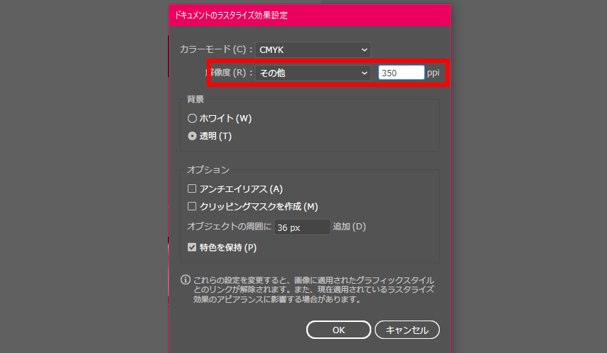「ラスタライズ効果の解像度」を印刷物用の解像度に上げましょう。