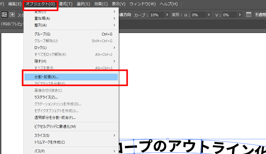 方法②「オブジェクト」→「分割・拡張」をクリック