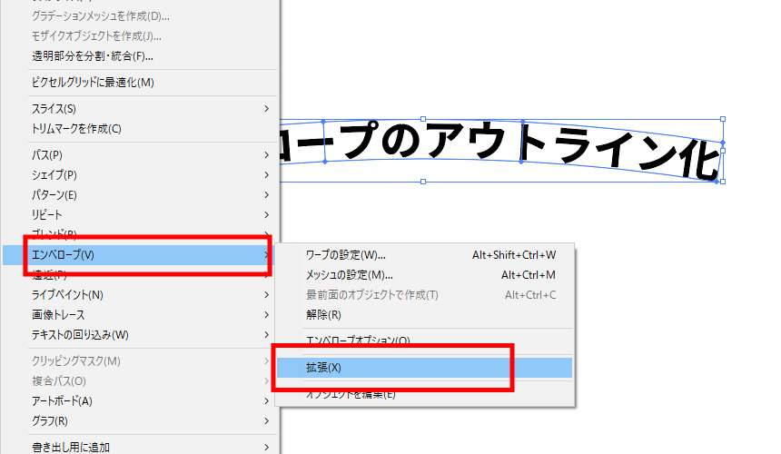 「オブジェクト」→「エンベロープ」→「拡張」をクリック