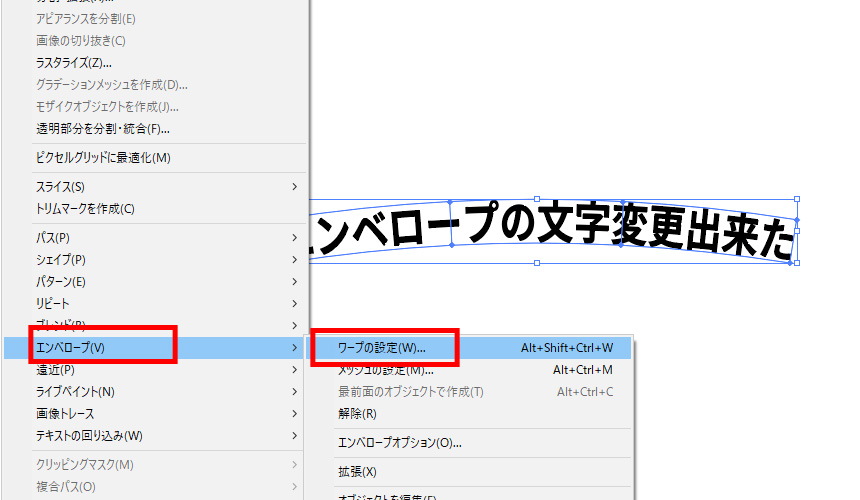 「オブジェクト」→「エンベロープ」→「ワープの設定」をクリックします。