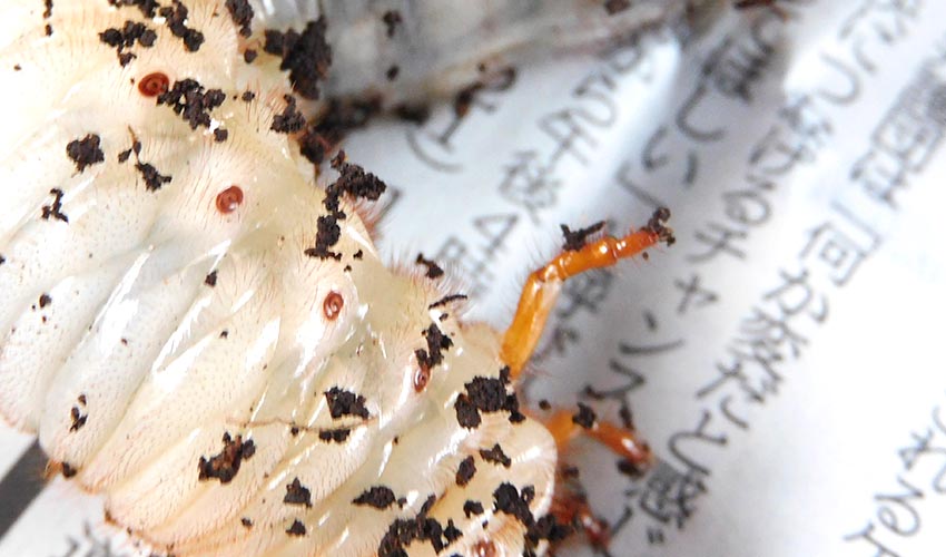 よく見ると顔はぽつぽつしている。また、触覚と顎があり、新聞紙の上でもカリカリして潜ろうとしている。
