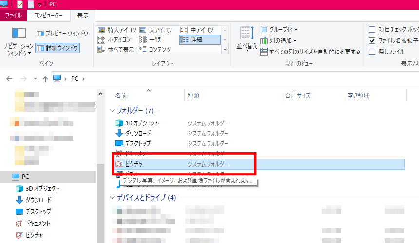「PC」→「ピクチャ」を開く